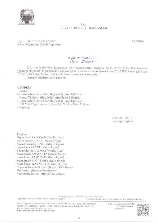 ŞUBAT/2026 DÖNEMİ MECLİS TOPLANTISI DAVETİYE YAZISI